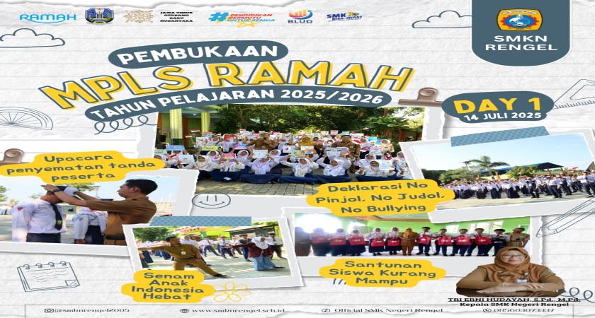 Rengel – Senin (14/07/2025), SMK Negeri Rengel menggelar kegiatan Pembukaan Masa Pengenalan Lingkungan Sekolah (MPLS) Tahun Pelajaran 2025/2026 bertajuk MPLS Ramah dengan penuh semangat dan antusiasme. Kegiatan ini dilaksanakan secara luring di Lapangan SMKN Rengel dan daring terhubung secara serentak dengan seluruh SMK se-Jawa Timur dalam rangka menyambut Murid baru yang resmi menjadi bagian dari keluarga besar SMK Negeri Rengel.